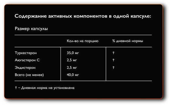 Аюгастерон С, Экдистерон, полученный из Левзеи сафлоровидной, в сочетании с Туркестероном дают максимальную анаболическую активность.
